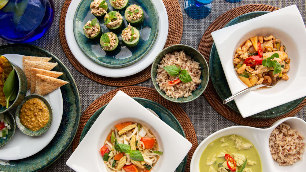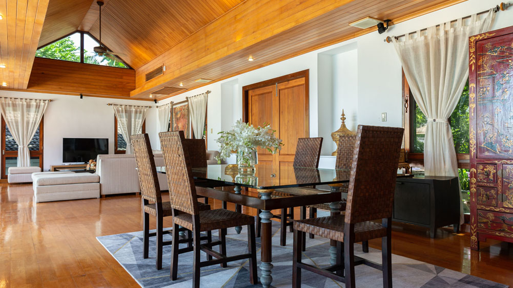 Vibrant interiors featuring Asian contemporary design, sculptures, and Thai teakwood furnishings