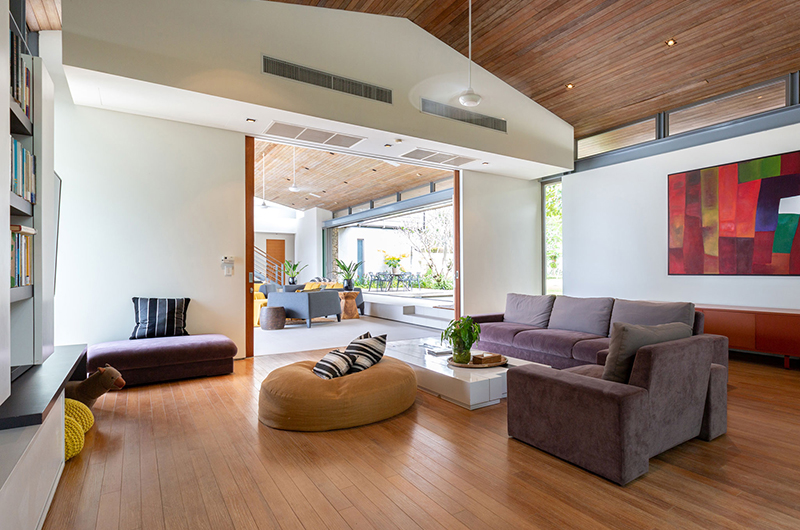 Set in a U-shaped layout around a 25-metre salt-water infinity pool, the villa seamlessly connects indoor and outdoor living. Floor-to-ceiling glass doors open to the sun deck, pool, and lawn, inviting sea breezes and breathtaking views. Inside, minimalist teak and tile finishes combine with designer furnishings for a serene yet luxurious atmosphere.