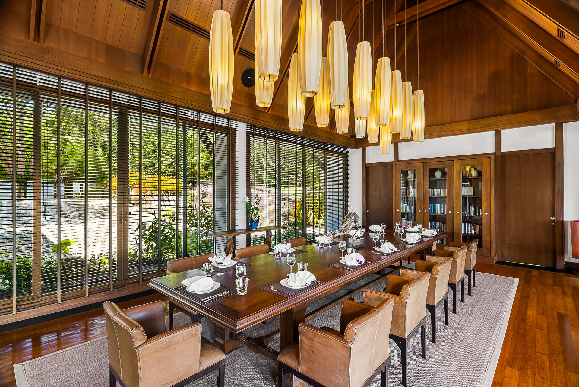 The main living pavilion features soaring ceilings, elegant furnishings, and panoramic views that take center stage. The villa’s multiple dining areas — indoor dining hall, outdoor terraces, and poolside pavilion — offer the perfect backdrop for both casual meals and special celebrations. Supported by a private chef, every dining experience becomes memorable.