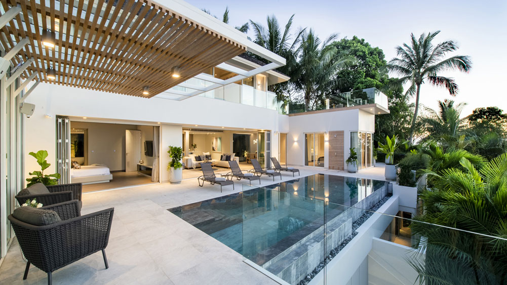 10-metre infinity-edge pool with marble terrace and sun loungers