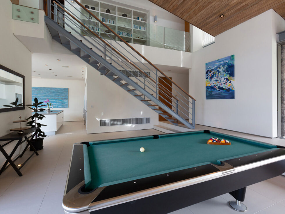 The villa features an open-plan living and dining area framed by floor-to-ceiling glass doors that fully open to the pool terrace. Outside, a 25-metre infinity pool stretches towards the sea, surrounded by sun-loungers and an alfresco dining pavilion with barbecue for meals by the water’s edge. Inside, plush furnishings, curated artwork and relaxed neutral tones define the interiors, while a media and games room add fun for all ages.