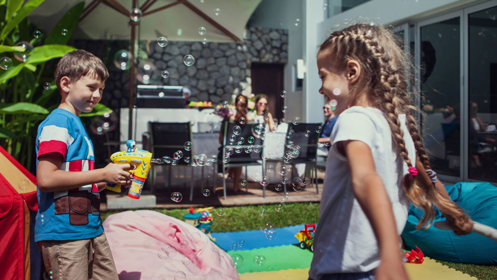 Games room with pool table and bar, plus a sunny children’s playroom.